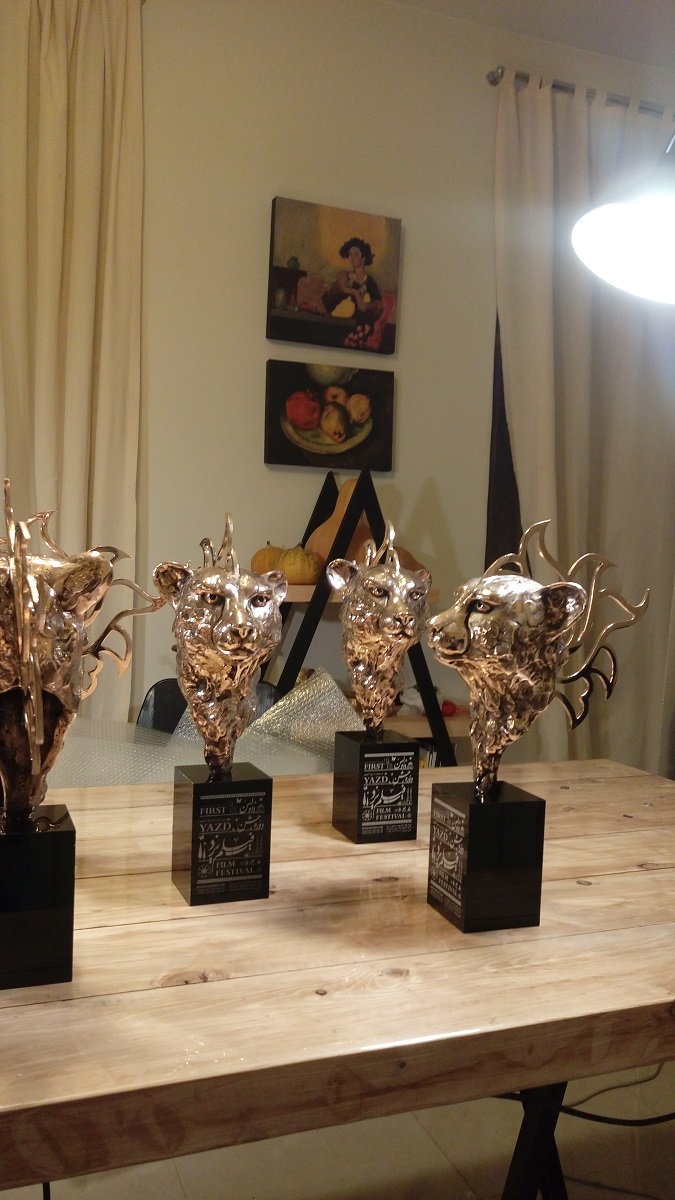 The first Yazd Film Festival was held while Iran was experiencing the concern of losing its cheetah population and the extinction of this beautiful animal. Yazd is known as one of the habitats of this creature in Iran, so the organizers of this festival decided to use the symbol of the Iranian cheetah as the symbol of the festival. On the other hand, Yazd is one of the origins of carpets with a “Hunting Ground” design; where pictures of cheetahs were used in carpets along with other animals. They made ten cheetah statues with an Iranian flower crown and given to directors and actors in this film festival.
