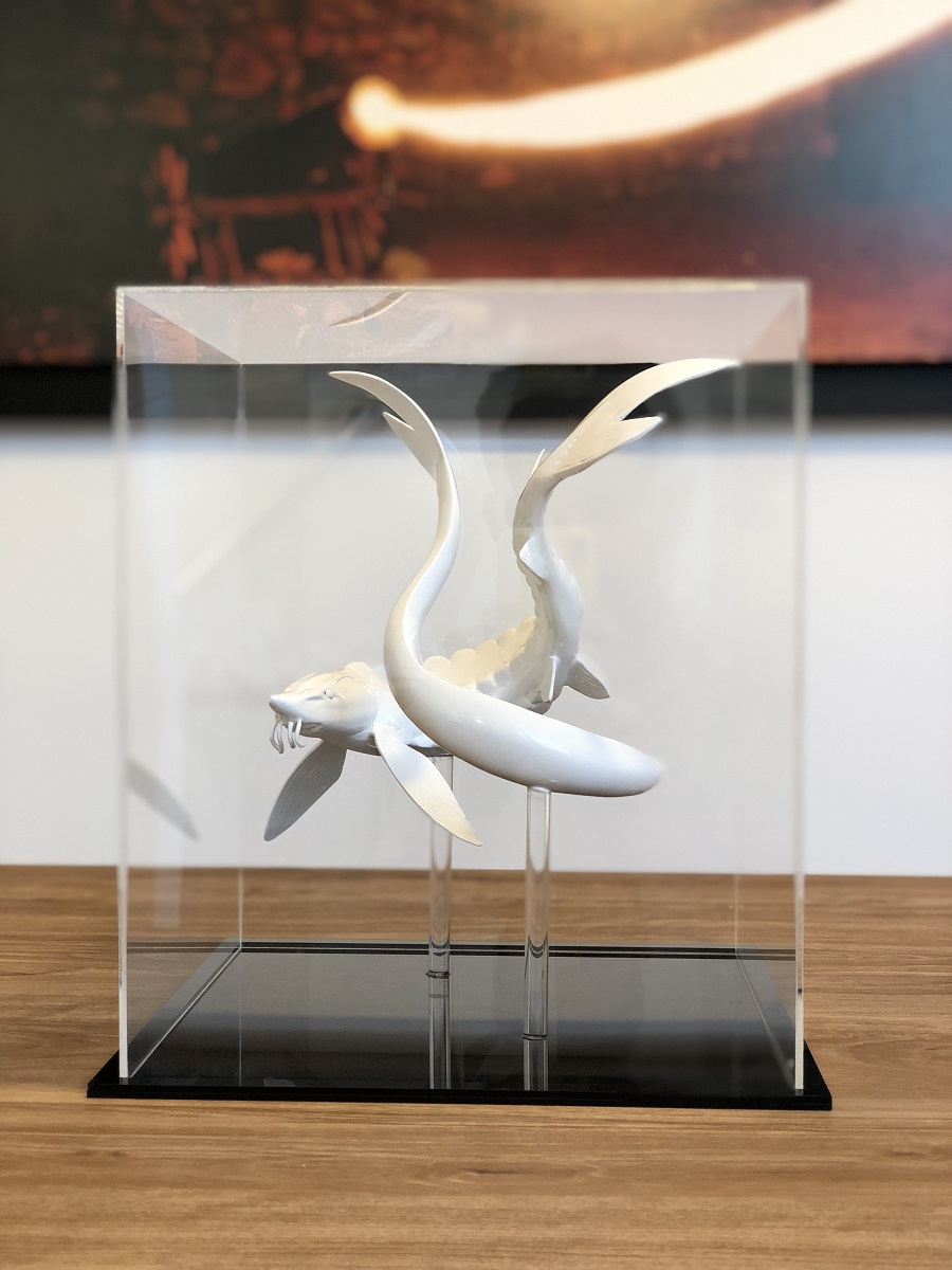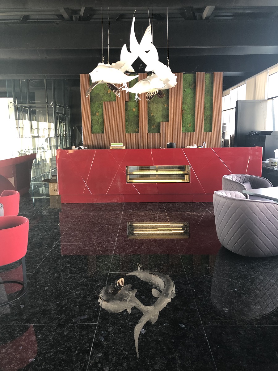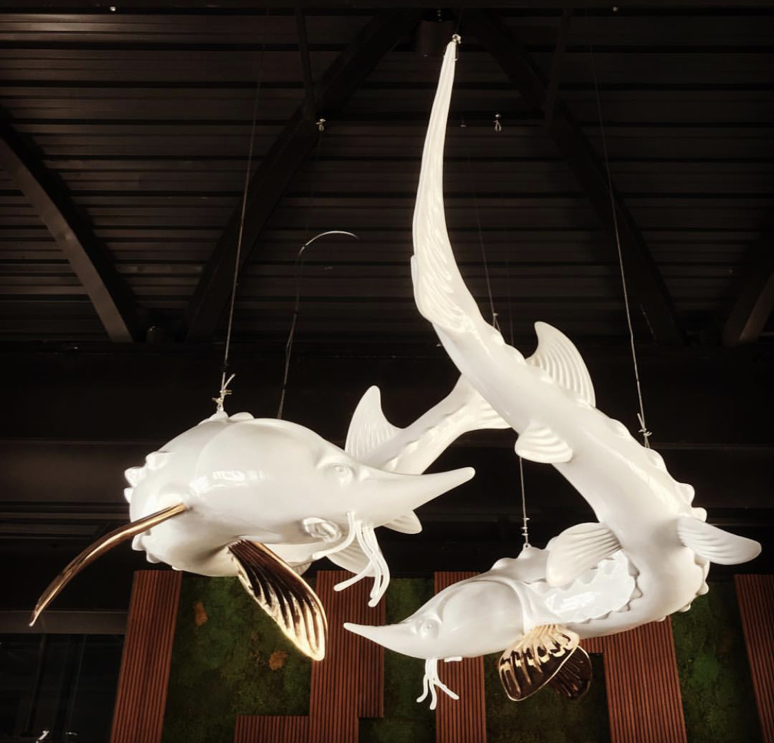 Espinas Palace Hotel is one of the largest hotels in Iran, located in Saadat Abad district of Tehran. This hotel offered to cooperate with them for its own restaurant on the top floor of this hotel. This restaurant consisted of two sections, the international section, and the Chinese section. This restaurant is one of the specialties. It is the most Asian restaurant in Iran, where the chef and all the restaurant staff are of Chinese nationality, which is one of the most expensive restaurants in Tehran, caviar is served, and during the meetings, they had with the restaurant manager and the hotel manager, they decided to design two large estrogen fish. According to the space that was intended for the installation of the statue, the fish had to be made in the form of a replica and about four meters and seventy centimeters.