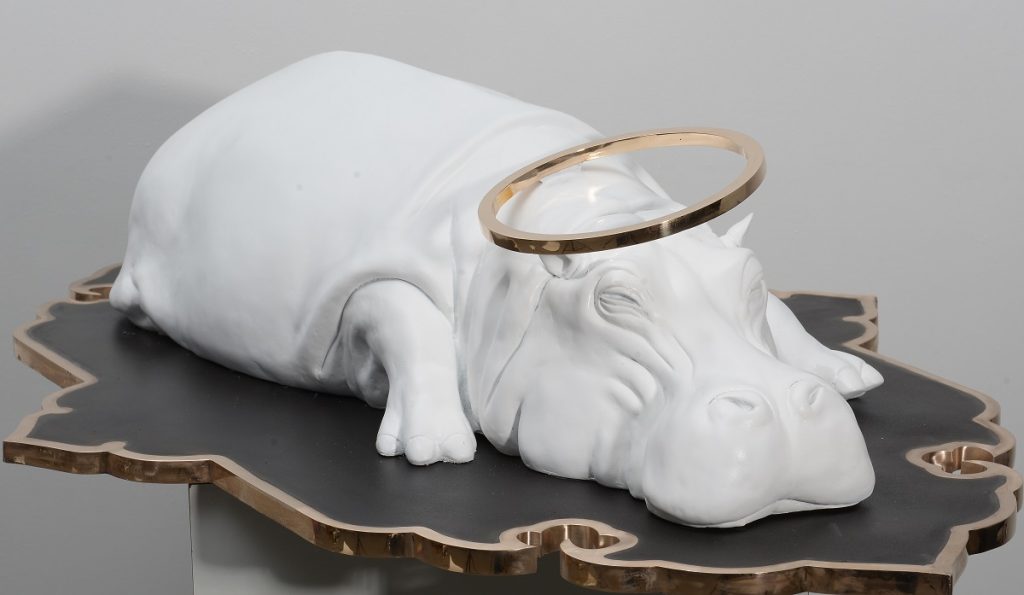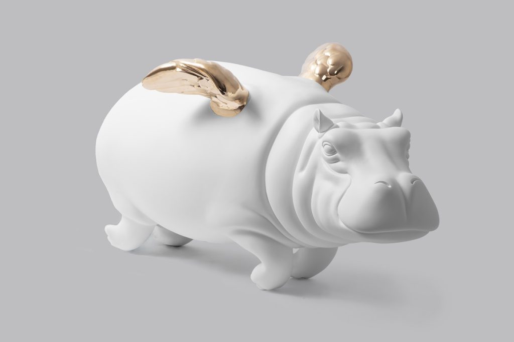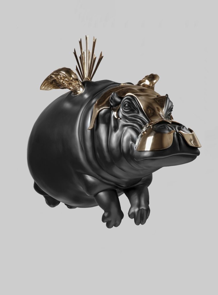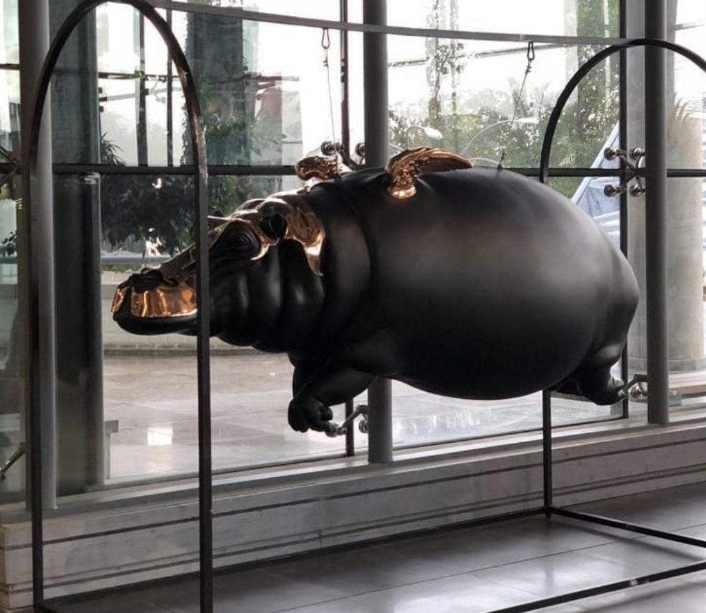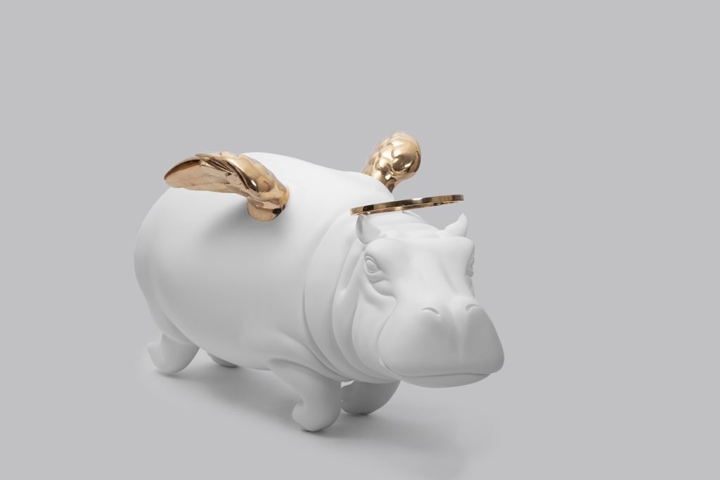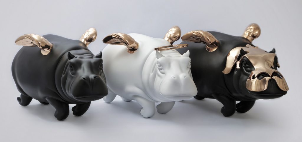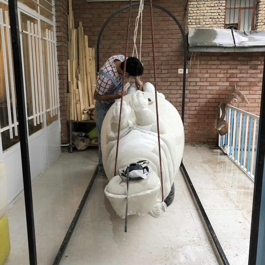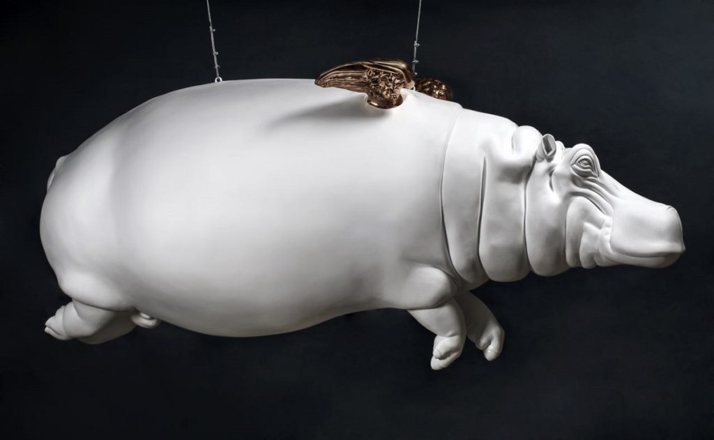 Mohsen Gholami started working on his collection of hippos and the idea of this collection was formed in the political context of his country, where people with violent behaviors were raving about heaven. A strange contradiction was surging in them without seeing themselves or trying to fix it. From his point of view, the hippos are creatures that could show us these human traits and behavior with more exaggeration, such as the shouting of an angel. A Sleeping heavy being flying with angelic wings as if these wings are holy. This paradox can be a flip for the strange things that happen in our country such as holy wars, forced heaven, and barbaric deeds that are under the Islamic shadow.