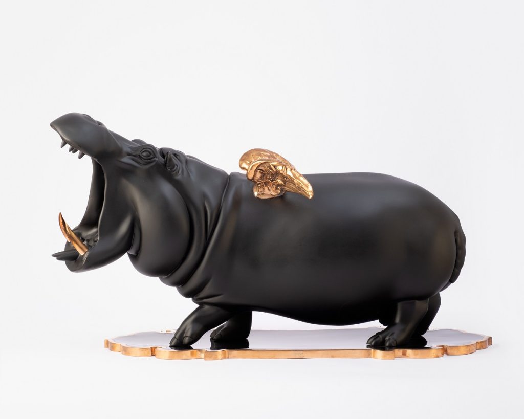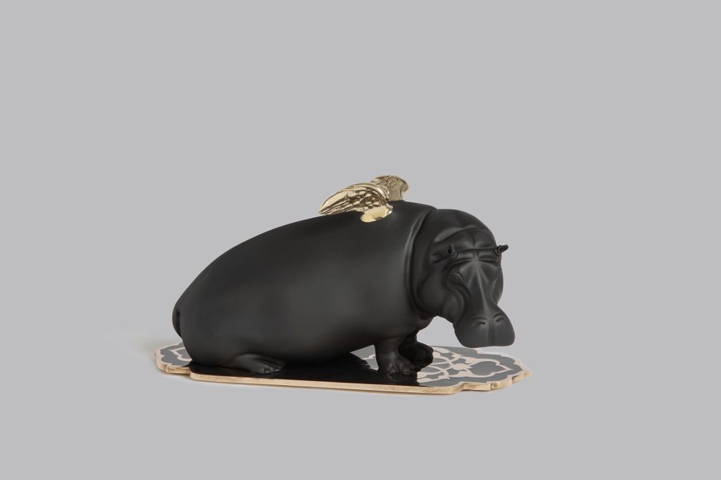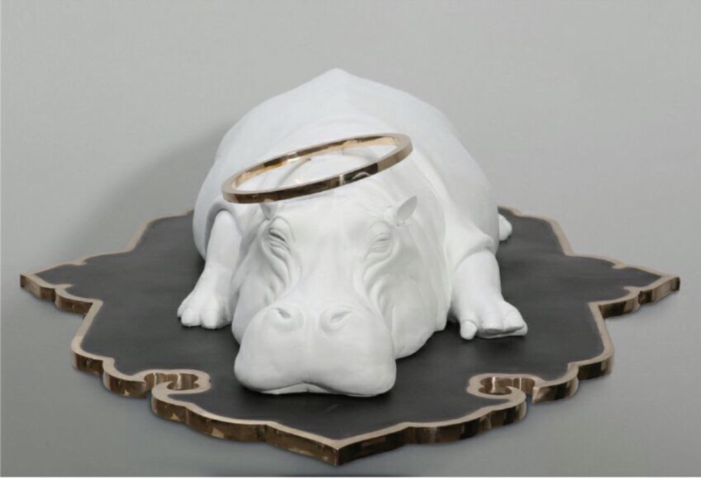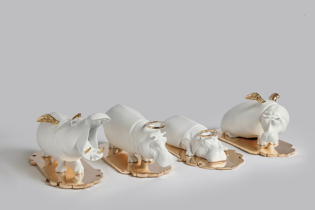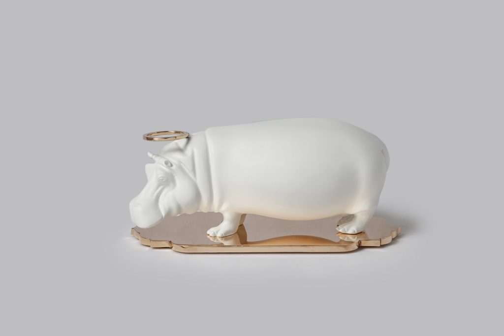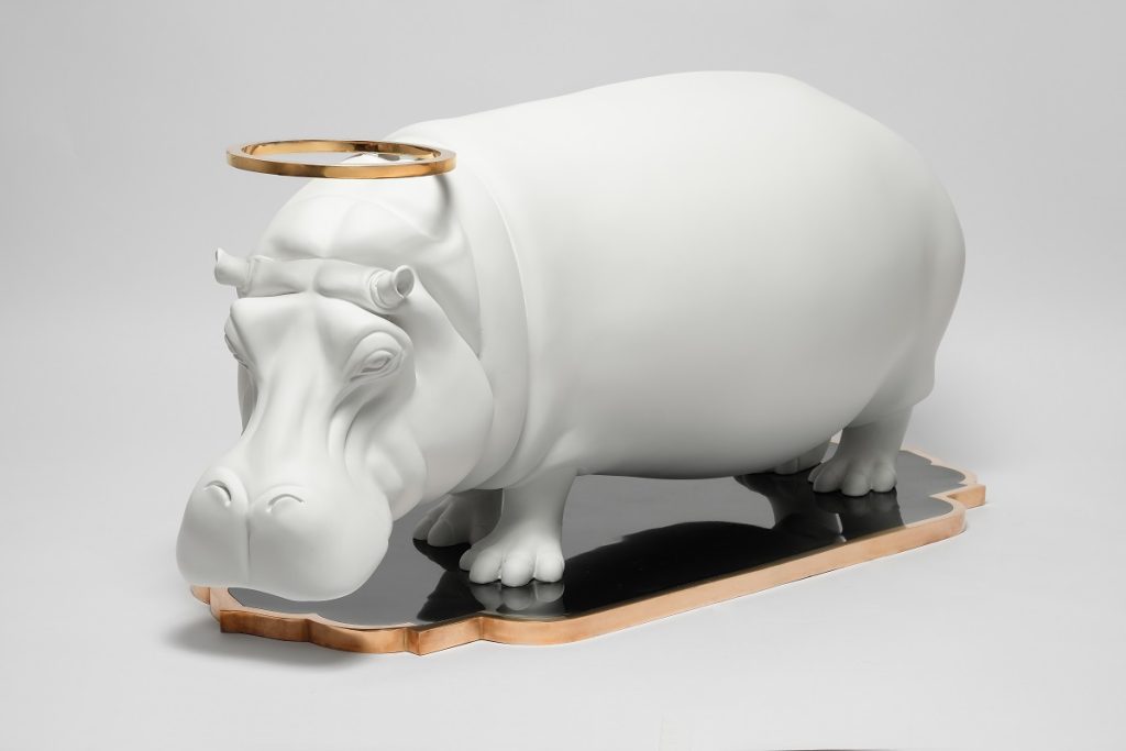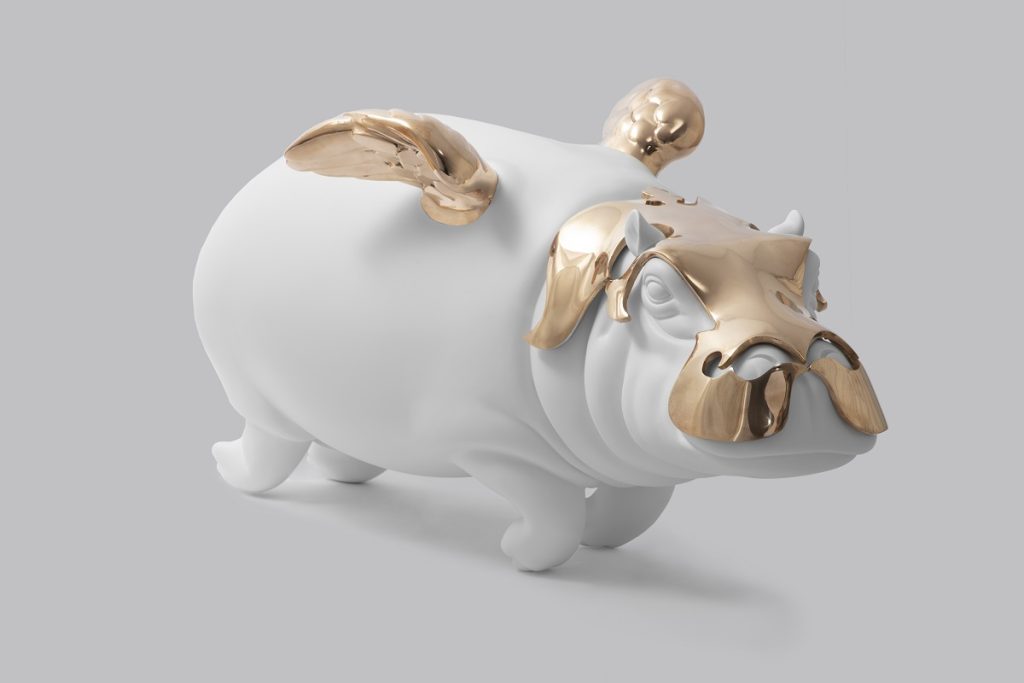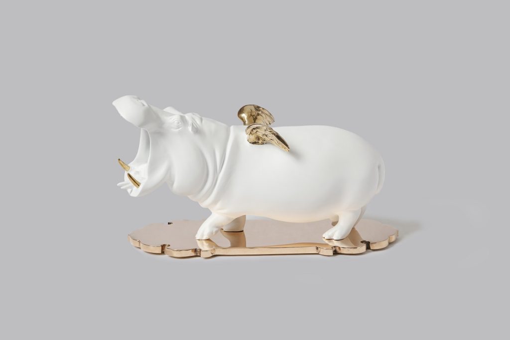 Mohsen Gholami started working on his collection of hippos and the idea of this collection was formed in the political context of his country, where people with violent behaviors were raving about heaven. A strange contradiction was surging in them without seeing themselves or trying to fix it. From his point of view, the hippos are creatures that could show us these human traits and behavior with more exaggeration, such as the shouting of an angel. A Sleeping heavy being flying with angelic wings as if these wings are holy. This paradox can be a flip for the strange things that happen in our country such as holy wars, forced heaven, and barbaric deeds that are under the Islamic shadow.