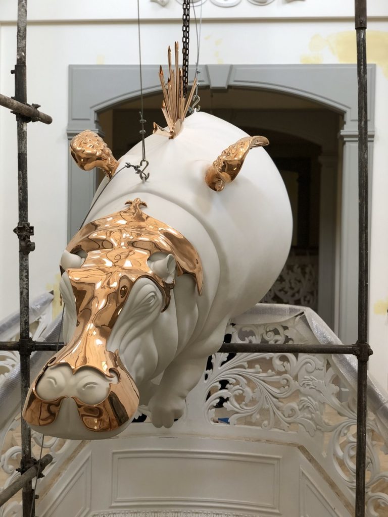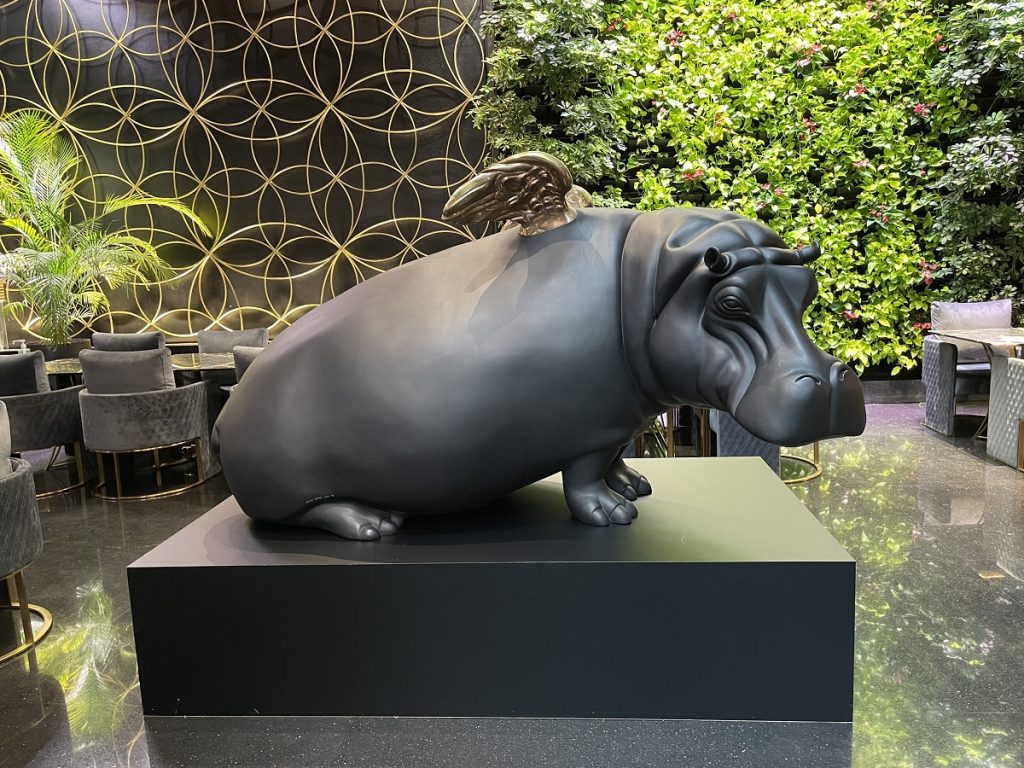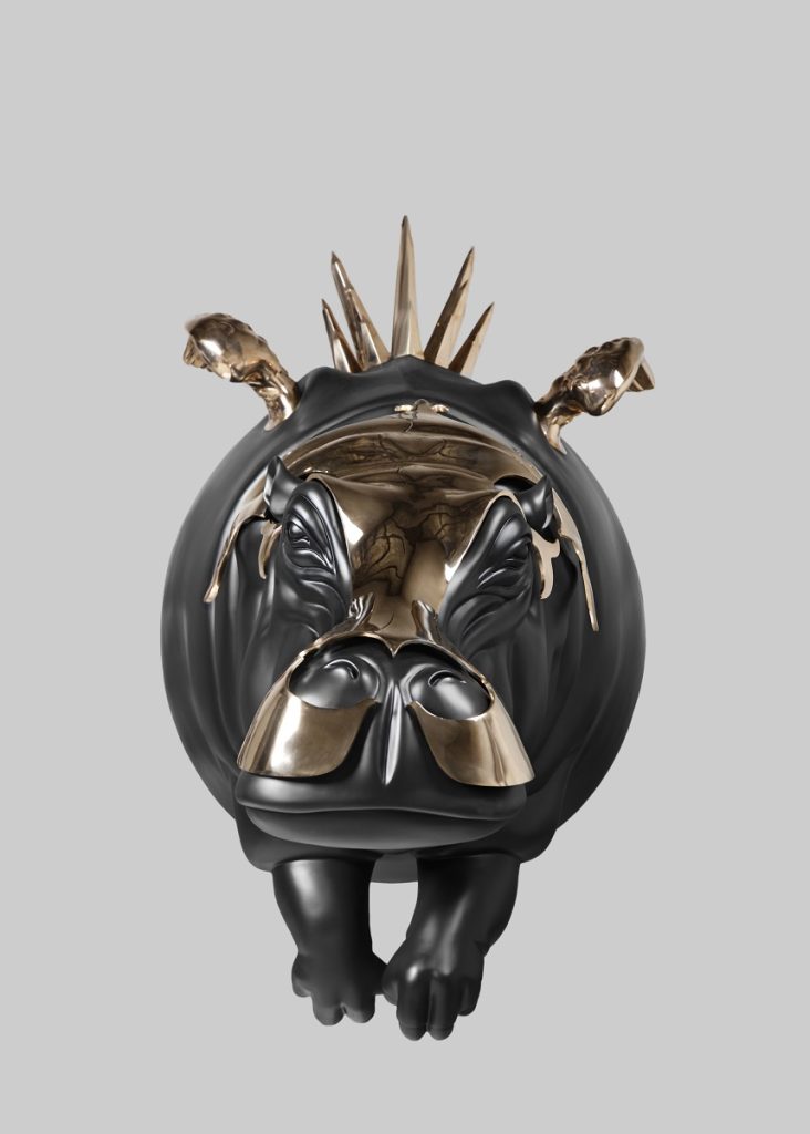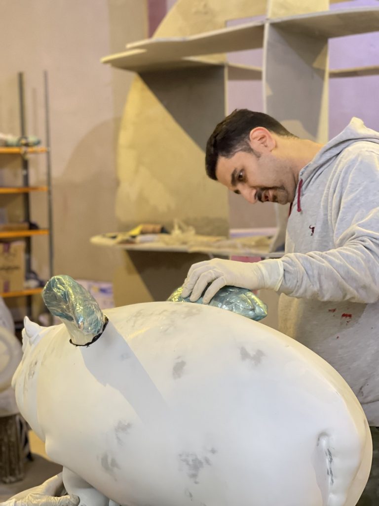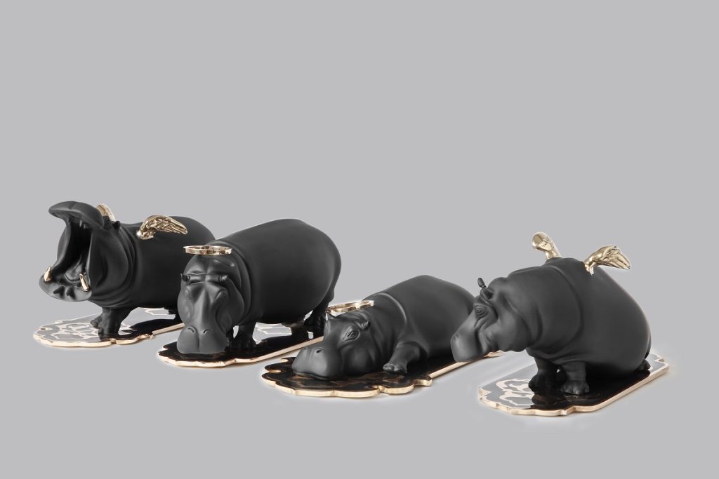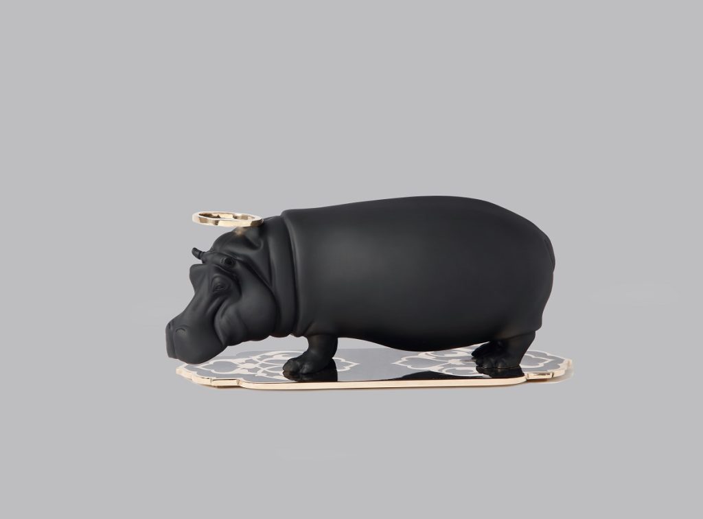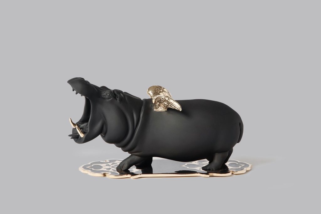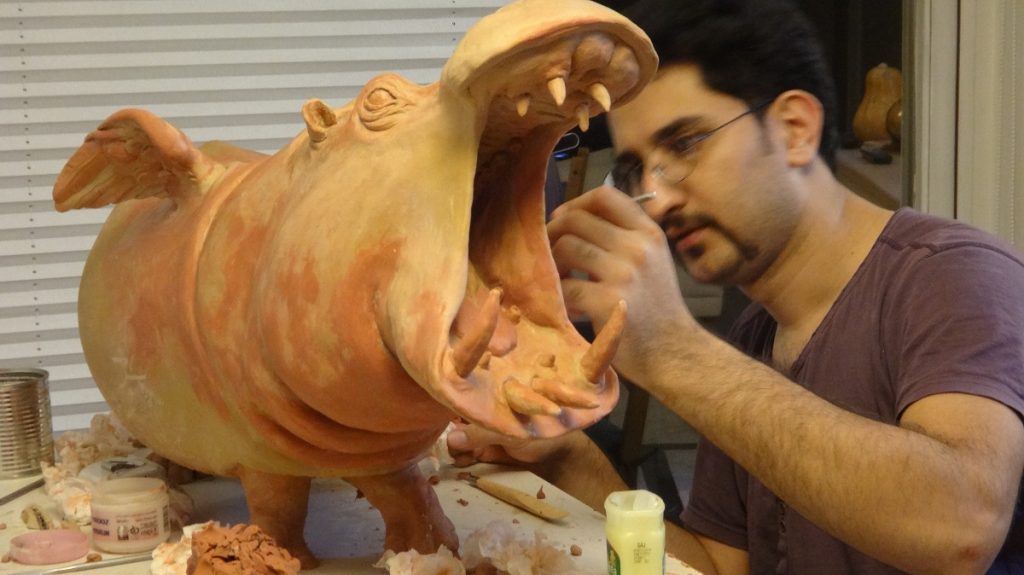 Mohsen Gholami started working on his collection of hippos and the idea of this collection was formed in the political context of his country, where people with violent behaviors were raving about heaven. A strange contradiction was surging in them without seeing themselves or trying to fix it. From his point of view, the hippos are creatures that could show us these human traits and behavior with more exaggeration, such as the shouting of an angel. A Sleeping heavy being flying with angelic wings as if these wings are holy. This paradox can be a flip for the strange things that happen in our country such as holy wars, forced heaven, and barbaric deeds that are under the Islamic shadow.